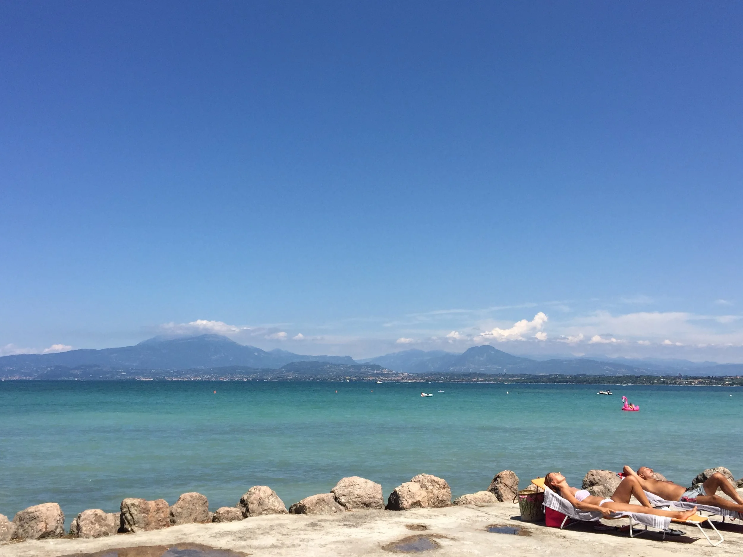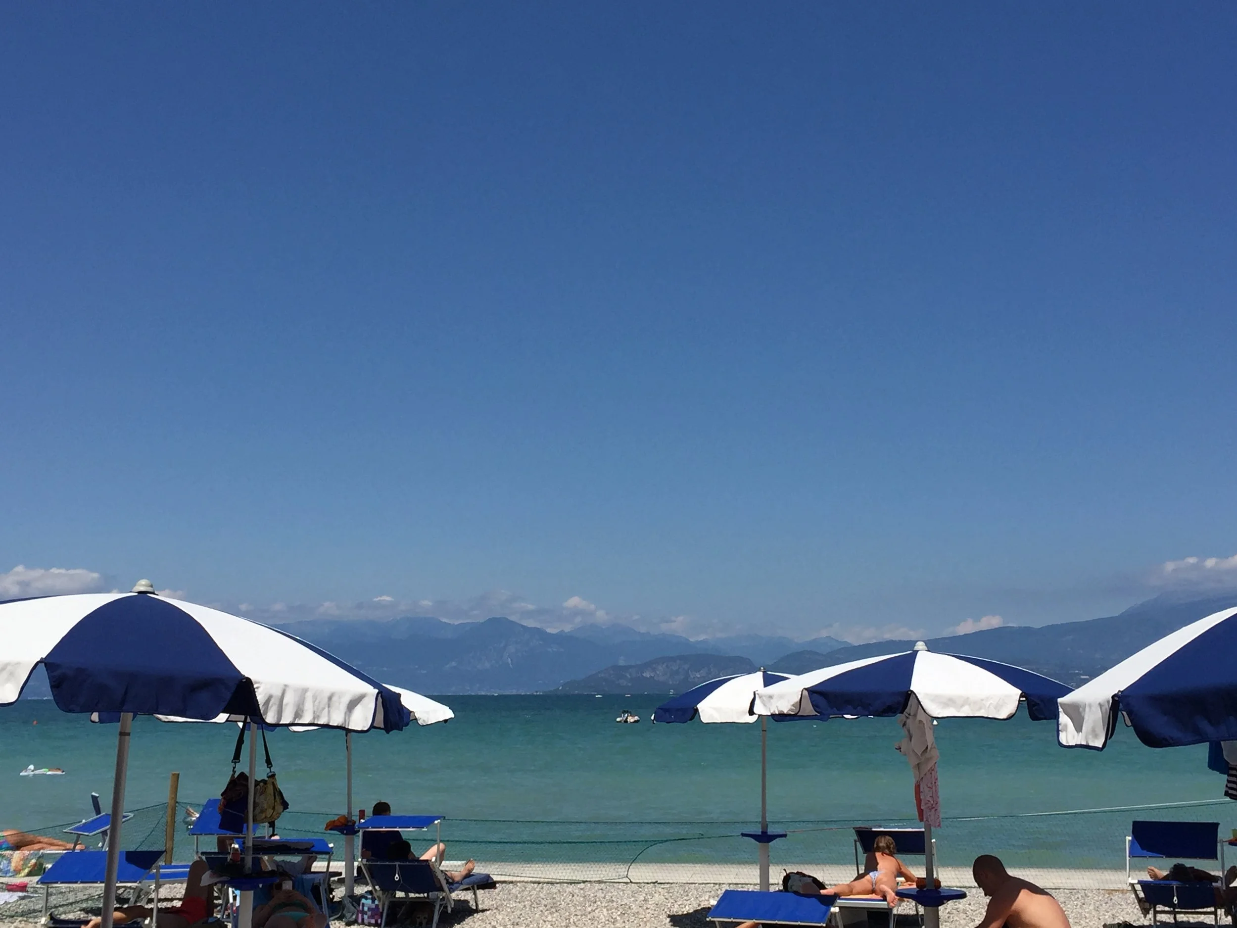Bajé del coche, y hubo un momento que confundí si lo que estaba viendo era un lago sino el mar. El agua era de un azul turquesa y brillante. Todo lo que mi vista podía alcanzar era agua, y unas montañas muy alejadas, pero no era capaz de divisar el extremo de la orilla del lago. Los bañistas en sus sombrillas de rayas azul y blancas jugaban a estar en una playa del mediterráneo en lugar de estar en el norte de Italia entre montañas y verde.