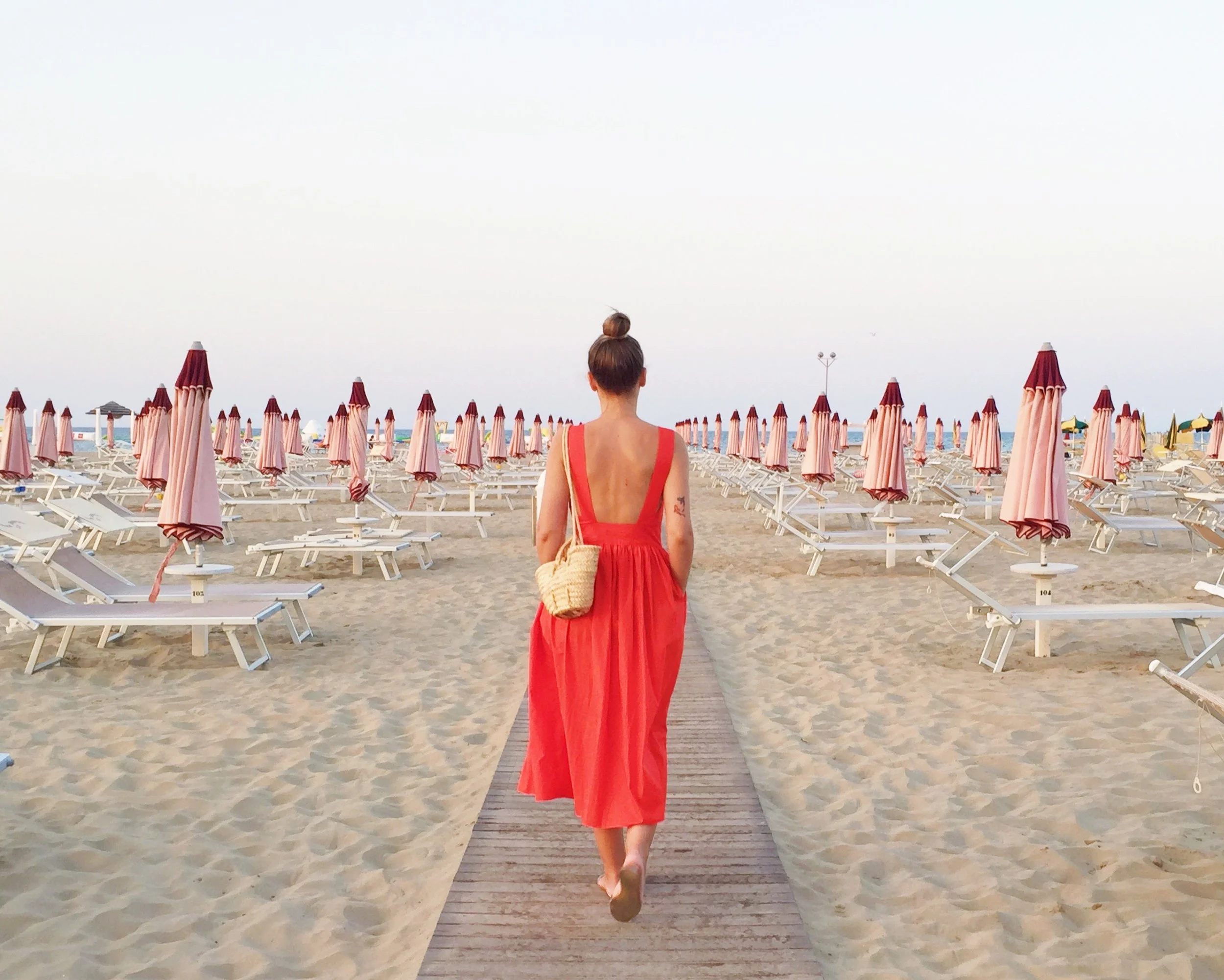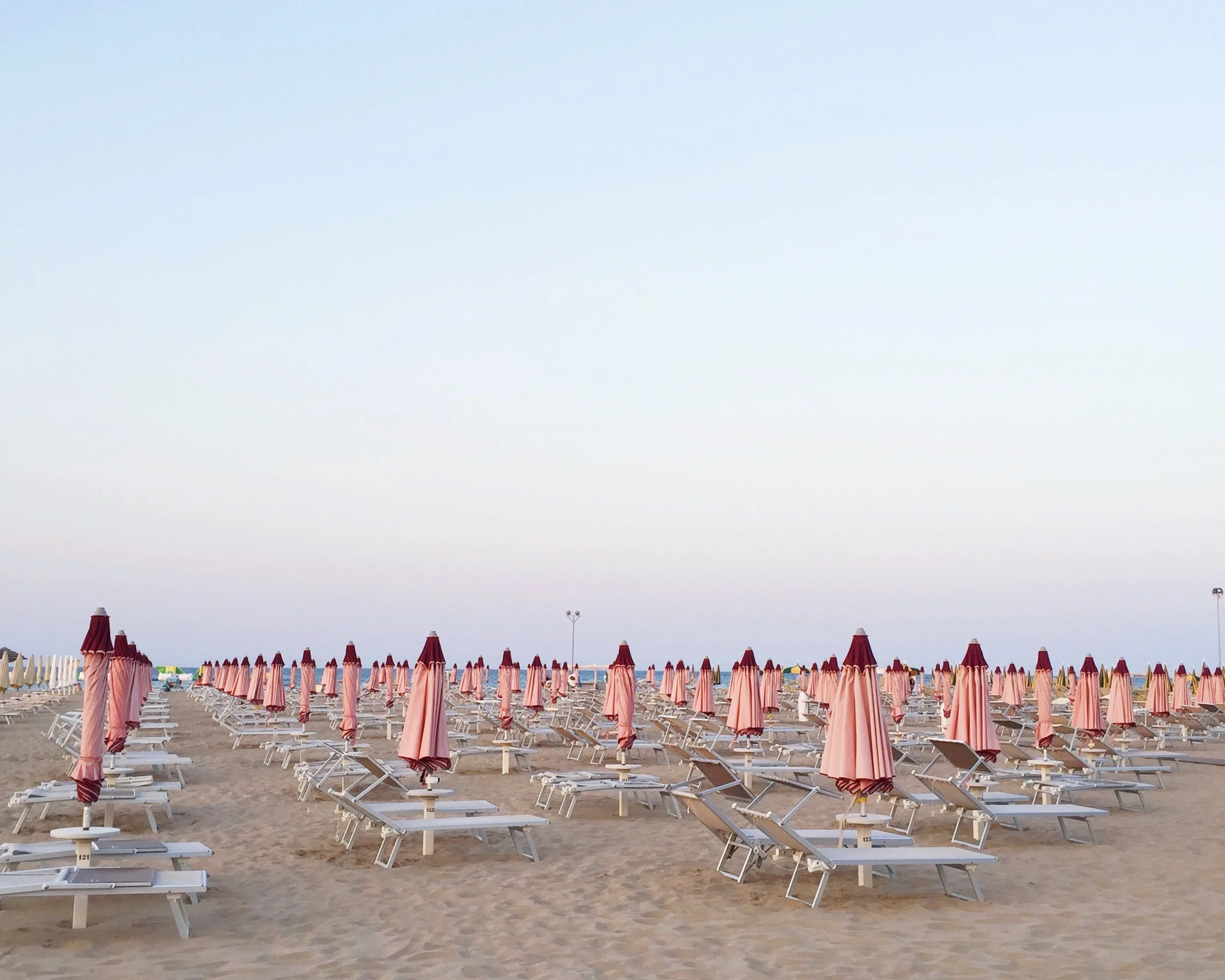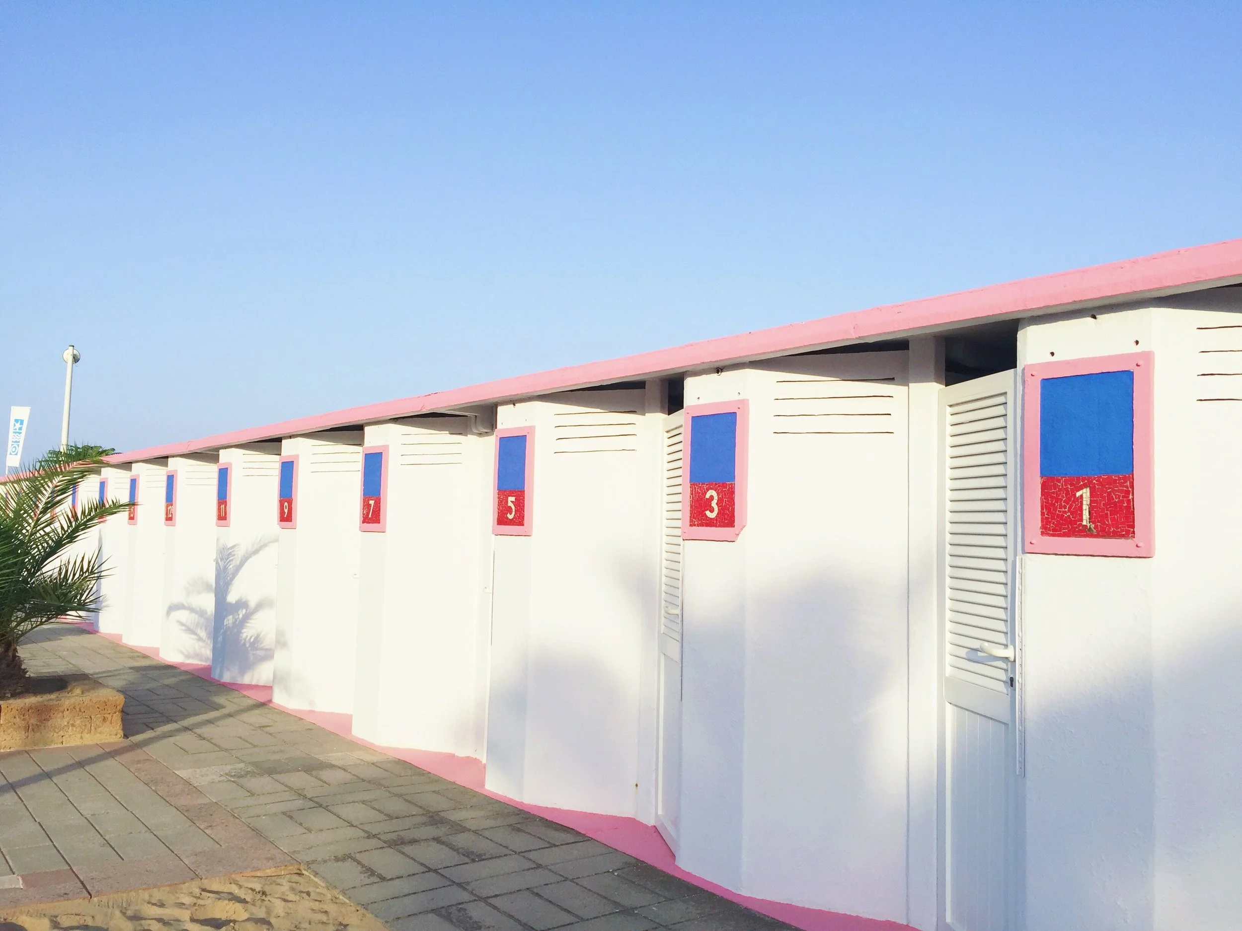 Pasar un día en la playa es imposible si no es debajo de una sombrilla. Y si encima la sombrilla es de color rosa, estás de suerte! Las entradas a las playas están precedidas por taquillas y baños que van en los mismos colores que las sombrillas. Un pasillo recto de baldosas de colores llevan hasta el mar que se divisa al fondo mientras una formación de sombrillas bien alineadas en ambos lados van abriendo paso. Un maravilla para los que amamos las perfectas simetrías entre tanto caos, ajetreo, vida y alegría de verano.
