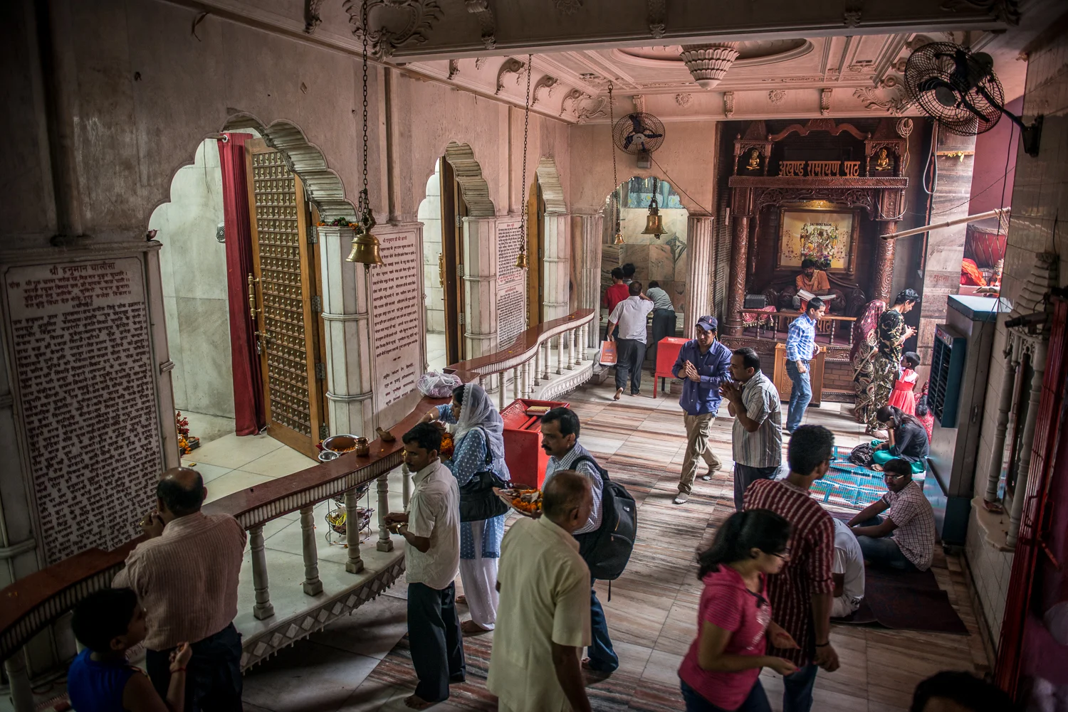 Eran tiempos del monzón, es decir, la época de lluvias. Empezaba una leve llovizna. Mi taxista quería ir a rezar, y quería ir con su “amigo” (el conductor) así que me llevaron a su templo. Parecía que era SU viaje, no el mío...y fuimos. Así conocí el Templo de Hanuman, un edificio en forma de mono que se ve desde diferentes puntos de la ciudad. Paseando por su interior, y entrando por la boca dentada del simio, saqué algunas fotos mientras mis guías hacían la cola para dejarle ofrendas a sus dioses.